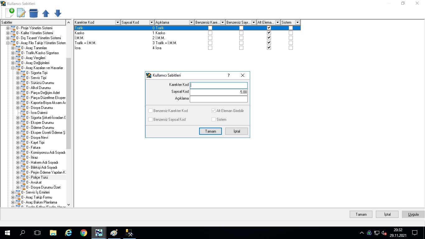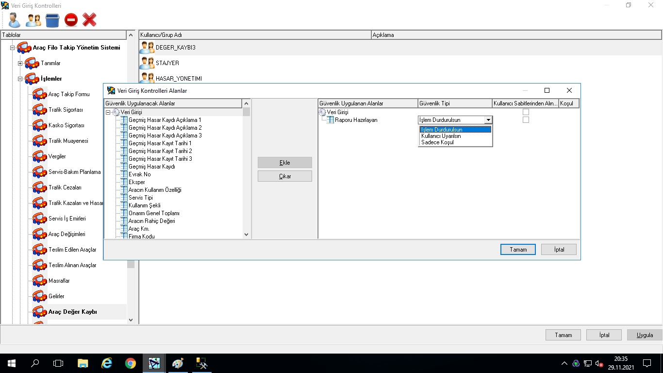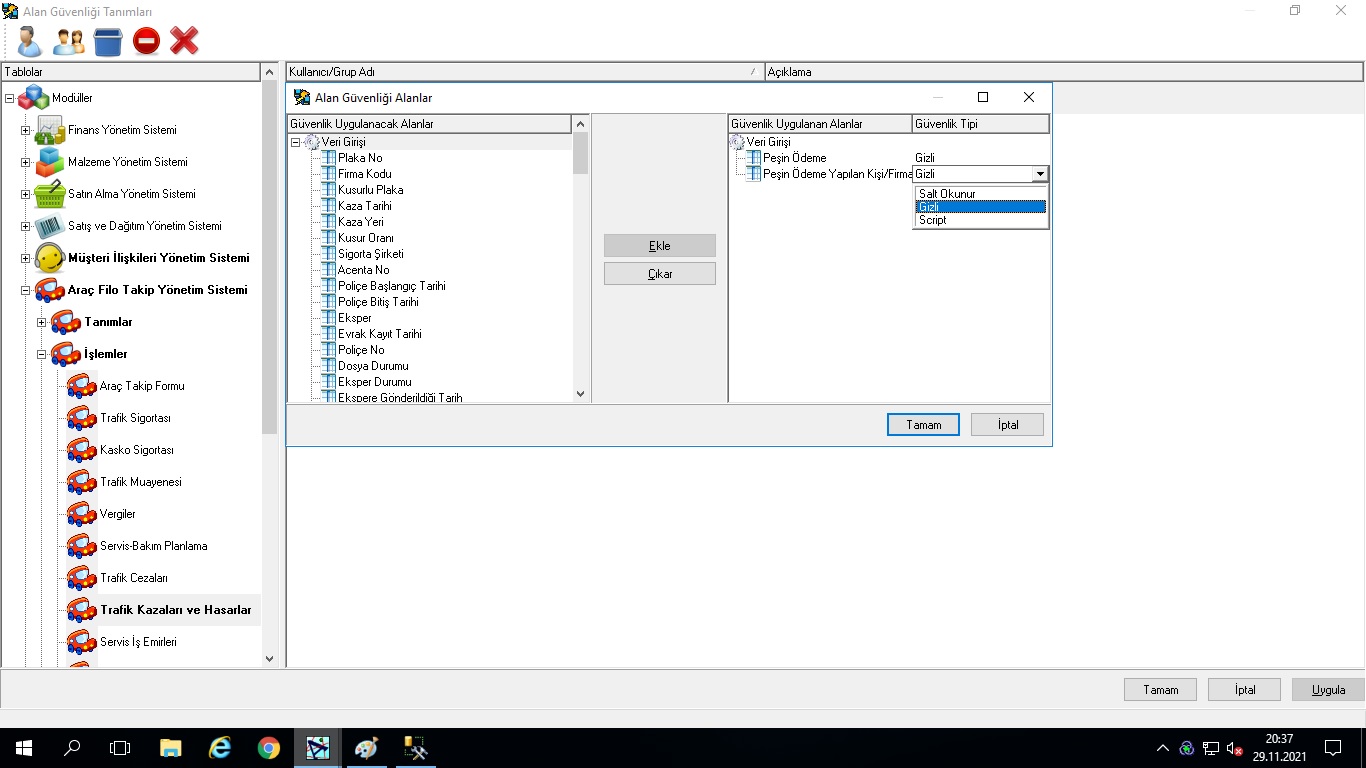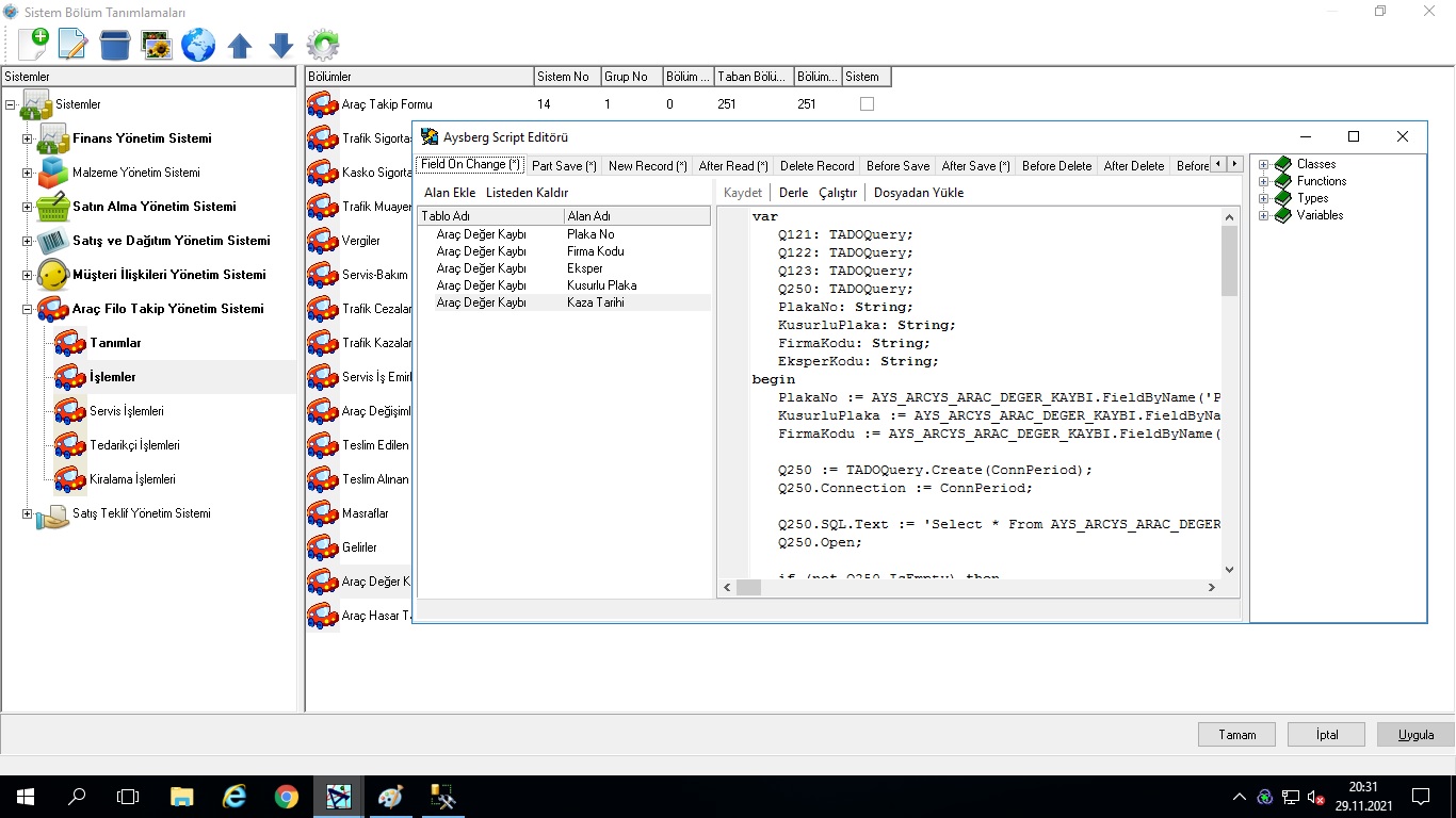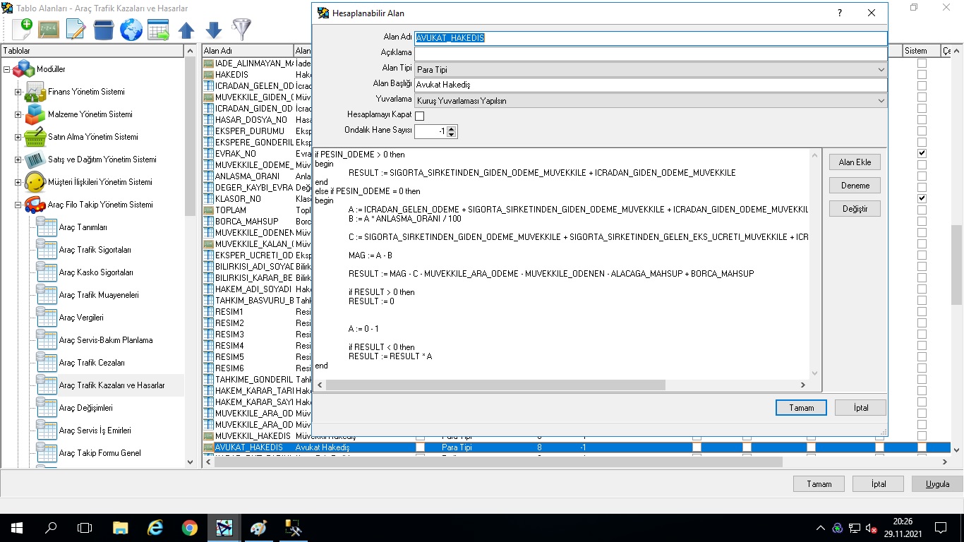 Geniş araç filosuna sahip işletmelerin, filoya dahil her araçla ilgili tüm bilgilerin takip edilebileceği modüldür. Araç takip formlarının takibi, araçlarla ilgili kasko, trafik sigortası, vergi, trafik kazaları, trafik cezalarının kayıt altına alınması, servis bakım planlarının yapılması, servis iş emirlerinin çıkarılması, teslim edilen araç ve teslim alınan araç takibi, müşteri ve tedarikçiler için servis takibi, servis bilgilerinin alım ve satış faturalarına aktarılması ve eşleştirilerek takip edilmesi ve raporlanması uygulamanın genel özelliklerindendir. Uygulamanın en önemli özelliklerinden birisi “Değer Kaybı” ve “Hasar Takibi” işlemlerinin çok detaylı yapılabilmesidir. Araç değer kaybı ile ilgili tüm verilerin girilebileceği, “Trafik Kazaları ve Hasarlar” seçeneği ile beraber, araç hasarlarının ayrıca takip edilebileceği “Araç Hasar Takibi” ve değer kaybı kayıtlarının girildiği ve ekspertiz raporlarının alındığı “Araç Değer Kaybı” seçenekleri mevcuttur. Sistem tüm hesaplamaları (avukat hakediş, komisyoncu hakediş, müvekkile ödenmesi gereken v.b.) verilen formüllere göre otomatik hesaplamakta ve ilgili cari hesaplara yansıtmaktadır.